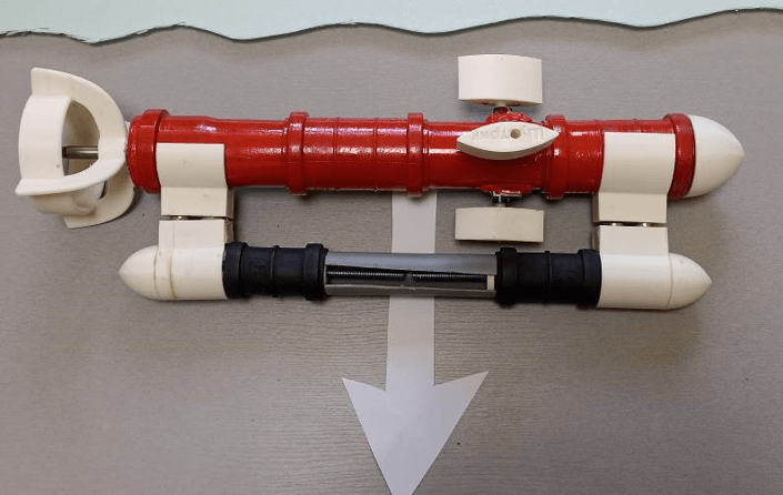 💬 «Поршни модуля плавучести приводятся в движение при помощи резьбовой шпильки и симметрично смещаются к краям модуля плавучести, в отверстие по центру модуля проникает вода и заполняет пространство между поршнями, уменьшая объем модуля погружения. При этом поршни сдавливают воздух, временно уменьшая его объем. Плавучесть лодки уменьшается, и она переходит в стадию вертикального погружения. Пространство между разведенными в стороны поршнями на данном этапе заполнено забортной водой».